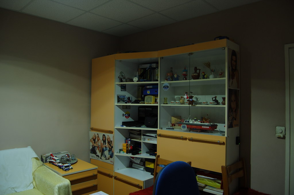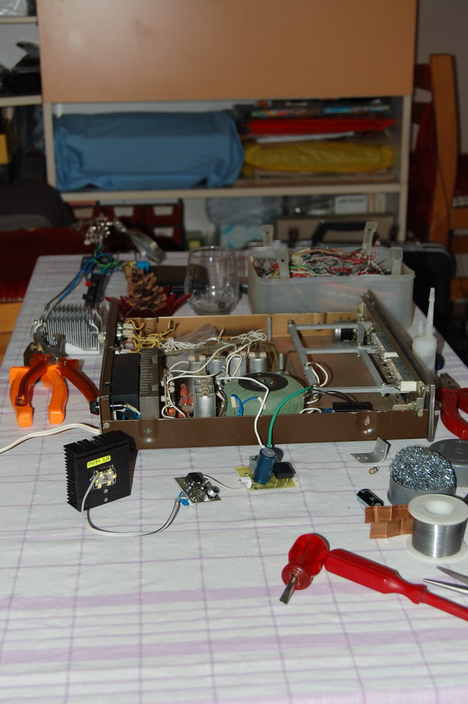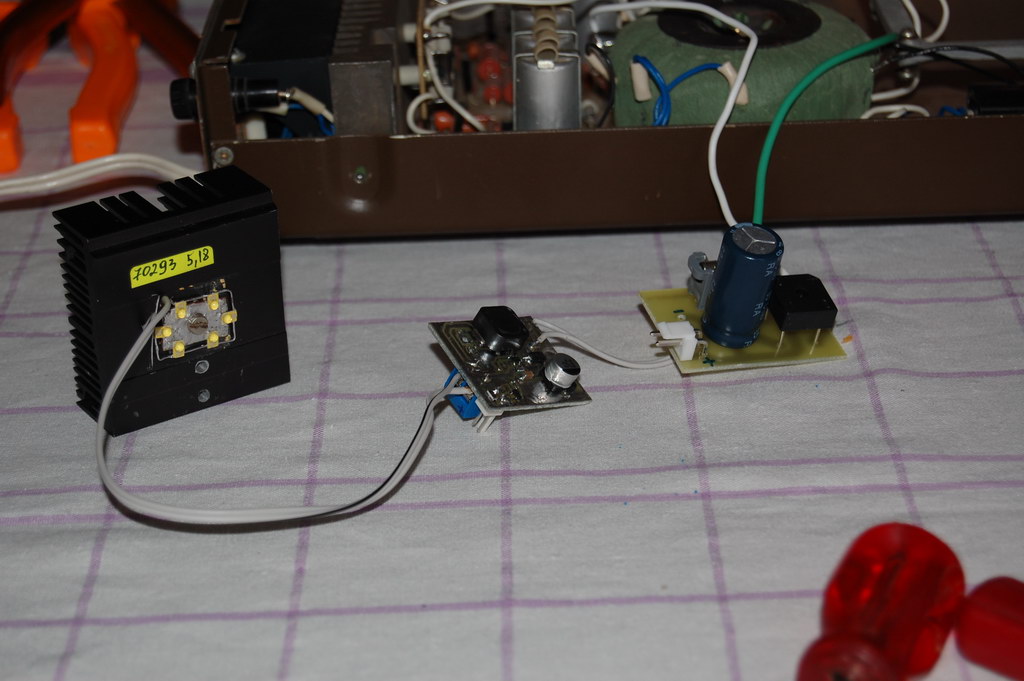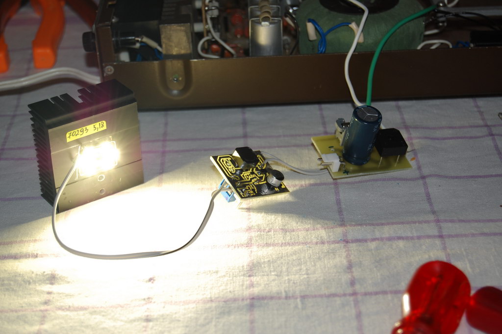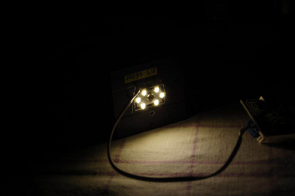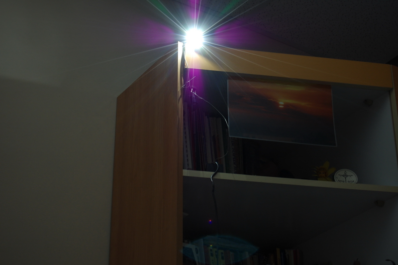 Ето че дойде ред и на снимките. Първите две снимки са от уводната част на проекта. Те показват осветеността от един светодиод при работен ток 500 мА. Третата и четвъртата снимки са при осветяване от завършеното осветително тяло, монтирано в тавана. Третата снимка е направена при същите настройки на фотоапарата, както тази с един светодиод. Това е направено с цел да покаже разликата в осветеността и не напълно ясната представа, която дава втората снимка. Разликите в осветеността на самия таван се дължат на факта, че в първия случай (един светодиод) излъчването е в хоризонтална посока срещу стените, а във втория случай (6 светодиода в тавана) то е с посока към пода и таванът е осветен само чрез отражения от предмети. Четвъртата снимка показва приблизително добра представа за осветеността на стаята с 6 светодиода. Силата на светлината (яркостта или интензитета) е близка до тази на 100-ватова крушка като разликите са главно от спектралните характеристики на двата светлинни източника. Иначе казано светлината е достатъчна, за да се чете книга или да се майстори нещо (аз например запоявах използвайки това осветление). Следващите снимки показват тестовата постановка с по-малък охлаждащ радиатор, който се загряваше много бързо и се оказа неподходящ. Снимките на постановката са правени само през деня (дори тези с тъмния фон, показвайки колко са ярки диодите).