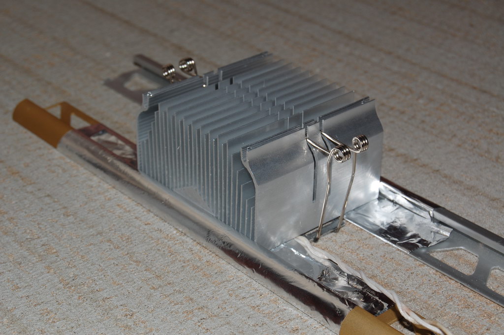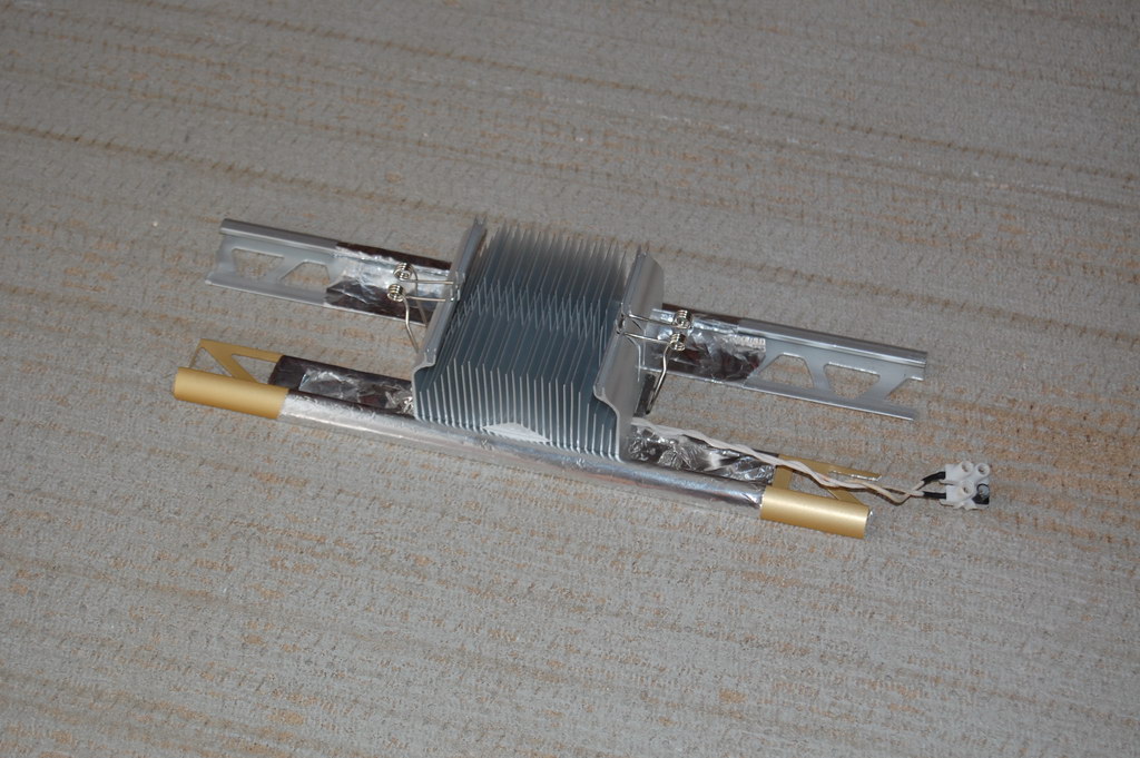 Накрая дойде ред и на кратко представяне на осветителното тяло. То също е показано на снимките най-долу. Използван е цокъл за вградено халогенно осветление (“луничка”). Добавен е 4мм-ов плексигласов прозорец пред светодиодите. Премахнати са пружинните механизми за монтаж (за съжаление не се вижда оригиналния цокъл на снимките), като са използвани за прикрепяне на охлаждащия радиатор. Цокълът е перманентно закрепен за плоскостта от окачения таван. Радиаторът е закрепен върху цокъла с помощта на двете пружини. Между радиатора и таванната плоскост има поставени два броя парчета от алуминиеви лайсни за керамични плочки. Те играят ролята на подсилваща конструкция, за да не се огъва плоскостта от тежестта. Увити са с алуминиево фолио, защото са различни по цвят (такива имах под ръка), а се виждат от долната страна. При така сглобената конструкция топлината от светодиодите се предава във въздуха не само от охлаждащия радиатор, но и от двете лайсни, както и от металния цокъл. Самите светодиоди са запоени върху медна пластина, която е прикрепена с помощта на болт към радиатора и допълнително термопредаването е подсигурено със сребърна термо-паста. Радиаторът е от BOX охладител за компютърен процесор (AMD64X2 5000+). Въпреки че той е бил проектиран да охлажда 65-ватов товар, в този проект се използва при различен метод на топлоотдаване. Вентилаторът е премахнат и се разчита на конвекция. Ето защо загряването е съществено въпреки много по-малката мощност на светодиодите в сравнение с компютърния процесор (около 12 вата към 65 вата). Комерсиалните решения често са доста по-ефективни и компактни, но цените им достигат до суми от порядъка на $50 (само за охлаждащ модул).