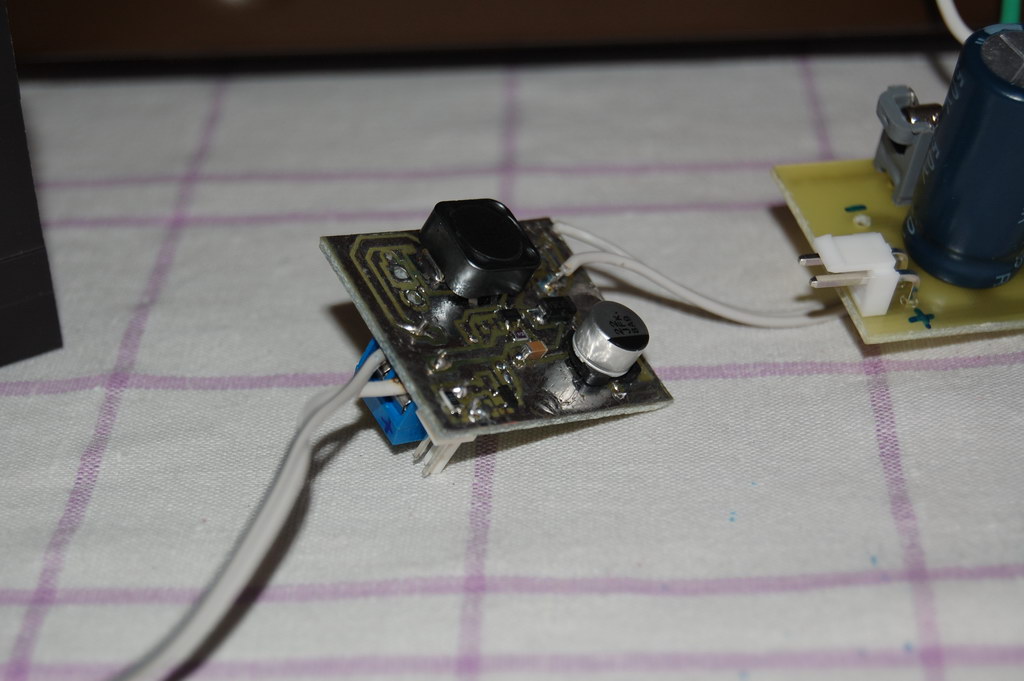 Наситената платка използва като основа схемата от документацията на драйвера след извършени преизчисления. Добавени са елементи за универсализиране на платката, така че тя може да се използва за различни схеми. В това число влизат стандартната схема без възможност за регулиране и схема с ШИМ регулиране от микроконтролер с извод тип отворен дрейн или CMOS/TTL нива. Без особени затруднения може да се свърже и потенциометър за аналогово регулиране. Използването на последния ограничава диапазона на регулиране в границите 25-99%. Регулирането чрез ШИМ генератор става в същите граници ако честотата на сигнала е не по-малка от 10KHz или в граници 1-99% при честоти не по-високи от 500Hz. Това е и ключовият проблем при реализацията на ШИМ регулатор. Използването на висока честота осигурява постоянен във времето изходен ток от драйвера, което означава липса на трептене на светлината (дори с висока честота, като максималните пулсации по документи са до 4%, но реално са много по-малки). Така обаче не може да се получи нисък интензитет. При използване на ниска честота имаме практически пълно регулиране, но изходният ток се накъсва. Тези изводи са направени на база измервания с цифров осцилоскоп при различните ситуации. Имайки предвид, че драйверът работи с честота на импулсния преобразувател по-малка от 1MHz, излъчването на електромагнитни смущения от схемата е изключено. Въпреки това остава недостатъкът трептене на светлина (невидимо при нормални условия). Ако честотата на ШИМ сигнала е около 200Hz осветени бързо движещи се предмети ще изглеждат сякаш се движат на интервали. Това може да е нежелан ефект в някои ситуации, така че ако някой използва този драйвер да го има в предвид. За да намаля този ефект до минимум, смятам да проектирам ШИМ регулатор, чийто изходен сигнал да бъде с променлива честота според коефициента на запълване на импулсите, за да се постигне максимално качество на излъчената светлина. На снимките в края на публикацията се вижда платката с драйвера. Малкият брой компоненти прави впечатление (на платката са монтирани и компонентите за връзка с ШИМ регулатора – транзистор, резистор и конектор). От снимките се вижда и стар предусилвател, чийто трансформатор използвам за първите опити със схемата. За крайния вариант ще използвам друг трансформатор. Пълна принципна схема не смятам да публикувам поне засега. Ако някой има интерес към драйверния модул, нека ми пише по електронната поща.