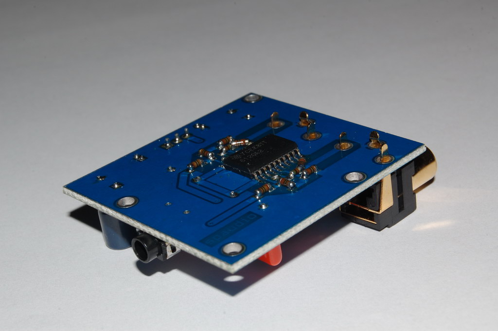 The PCB which can be seen on the photos at the bottom is specially designed for this project. All requirements from the amplifier’s datasheet are kept, like minimal distances between the components and minimal length of the input and output traces. The PCB is designed to as much symmetrical as possible so it matches the schematic very well and this guarantees equal signal path for both channels. Another requirement is also kept, specifying the ground plane area which should not be close to the input path so parasitic capacitances will be avoided. Specially designed metalized openings help for maximizing the heat dissipation of the IC, which has ThermalPad on its bottom side.