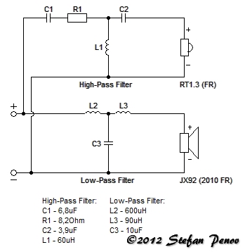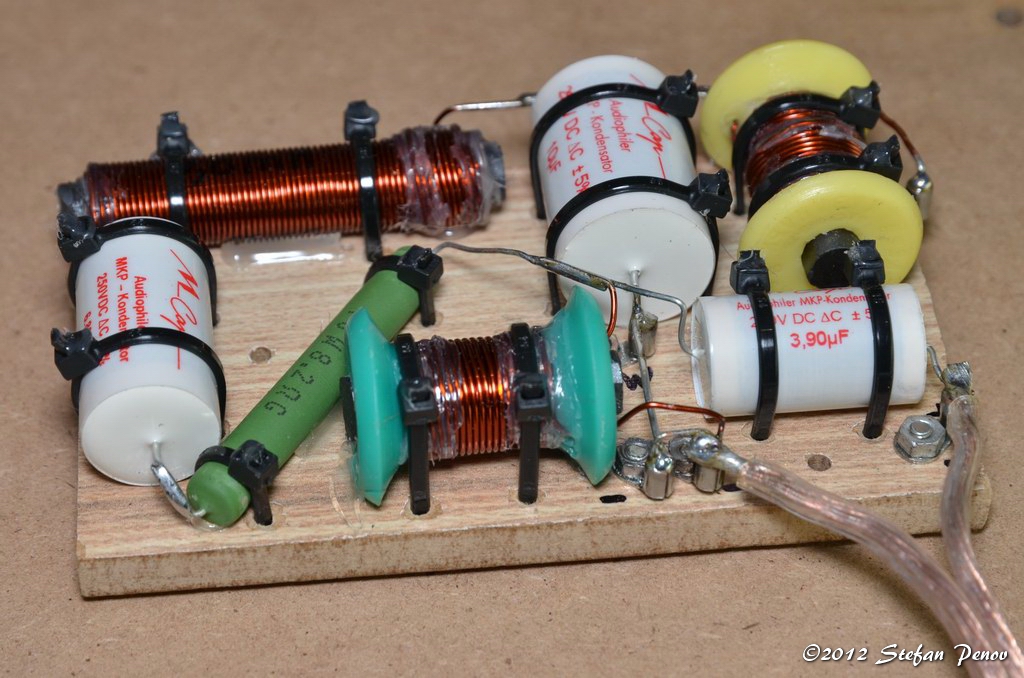 Избрах филтър от трети ред и за двата говорителя, като за лентовия добавих и резистор за компенсиране на по-голямата чувствителност (92dB към 85dB за JX92). Избрах метал-оксинди безиндуктивни резистори Mundorf и полипропиленови кондензатори от същия производител. Бобините навих сам.