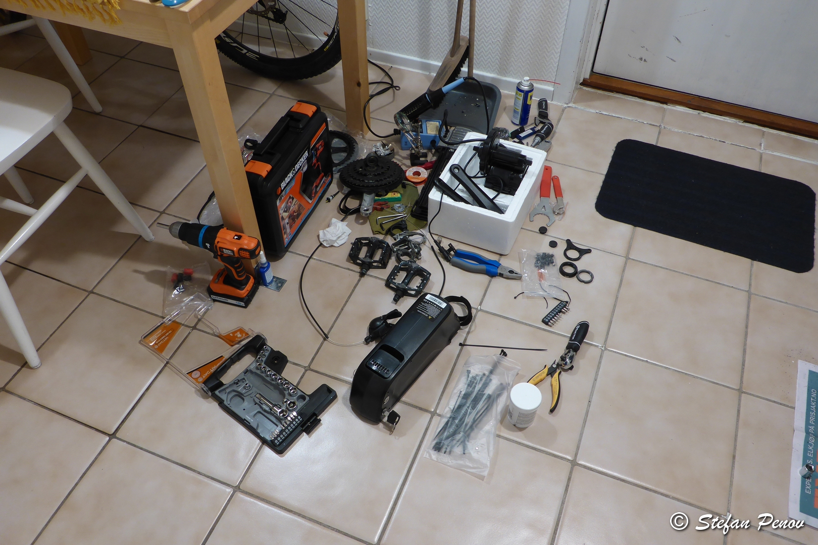 In addition to the kit I also needed some special tools. I had some of them and others I had to buy. If you don’t do everything on your bicycle at home, then you will probably need to buy some tools for the installation of such kit. Other brands will probably require different tools. Sometimes the dealers offer sets of all tools needed which will save you time looking for them, but might be a bit more expensive. For Bafang’s BBS02 kit you need crank extractor, bottom bracket specific wrench to remove your old bottom bracket and install the new motor there, lock nut wrench, Philips screwdriver and hex wrenches. Another thing you will need is a chain tool if your chain doesn’t have “quick link”. You will not need your front derailleur and if you want to remove it to save weight, you need to cut the chain. As you can see in the photo below, I used a lot more tools but more for that later.