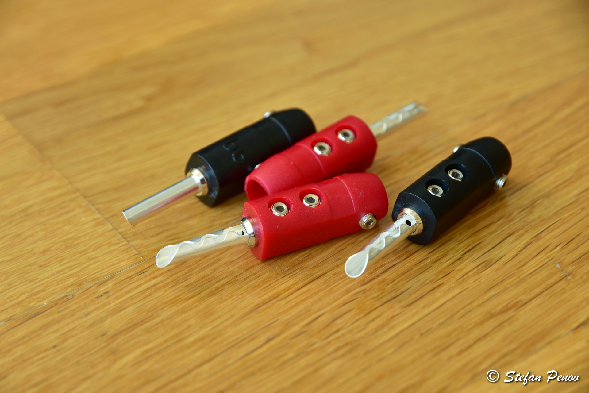 The connectors are AudioQuest SureGrip BFA 300s. Typical banana connectors of a high quality. They have pure silver plating with no nickel or other metal mixed. That is why they don’t have that mirror look.