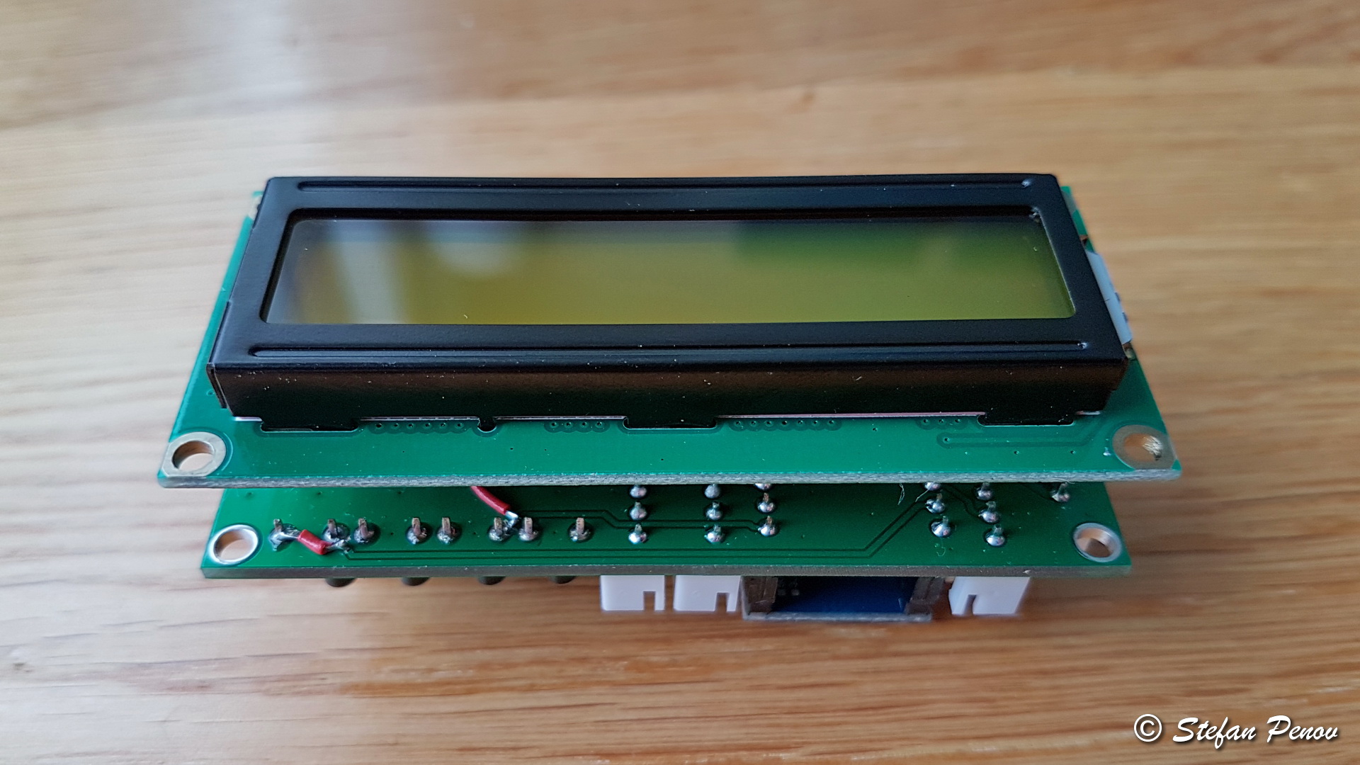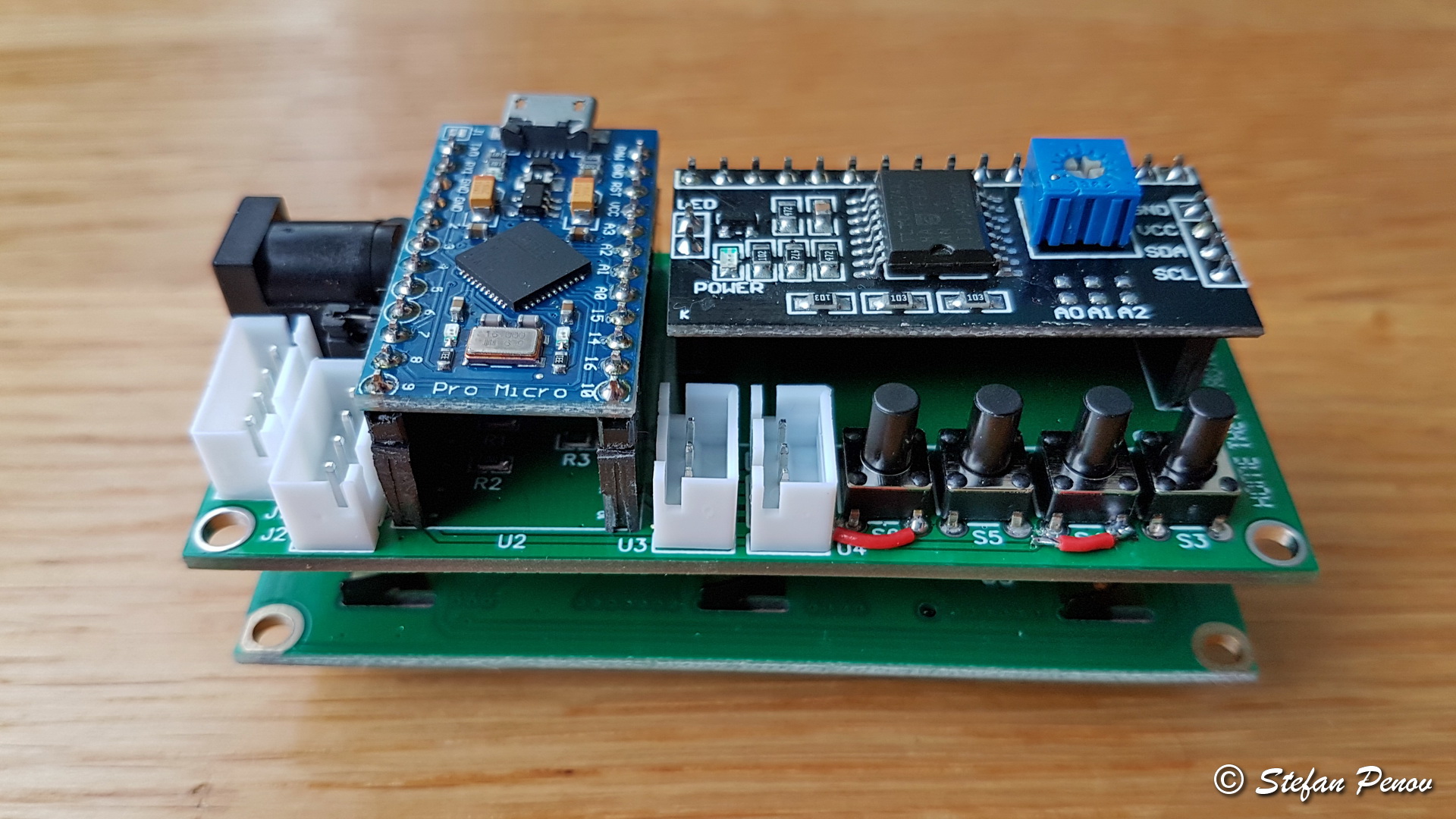 The small board at the top left corner is Arduino Pro Micro. It is not a standard Arduino design. It is based on two different Arduino models, combining small footprint with a lot of microcontroller resources. It is easy to find on eBay and is quite cheap. The darker board at the top right corner is I2C to parallel converter for easy control of character LCDs all the way to 4×20 size. Using this converter you don’t need to use many microcontroller pins for communication with the display. There are Arduino libraries available for serial LCD control that work well with this one.