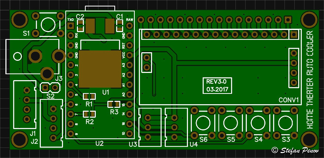 My TV table is separated in three zones, two of which I filled up with things like PlayStation, AV receiver, disc player, NAS, Internet modem. All those create heat during operation and some of them become quite hot. This is the reason I decided to design my automatic cooling device to operate in two separate zones. I wanted to make something fairly small and simple to use. I had one 16×2 character LCD (standard HD44780 type) and thought it can be of use for that project. I based the PCB design around that display as you can see in the photo. Let’s see what else I had available.